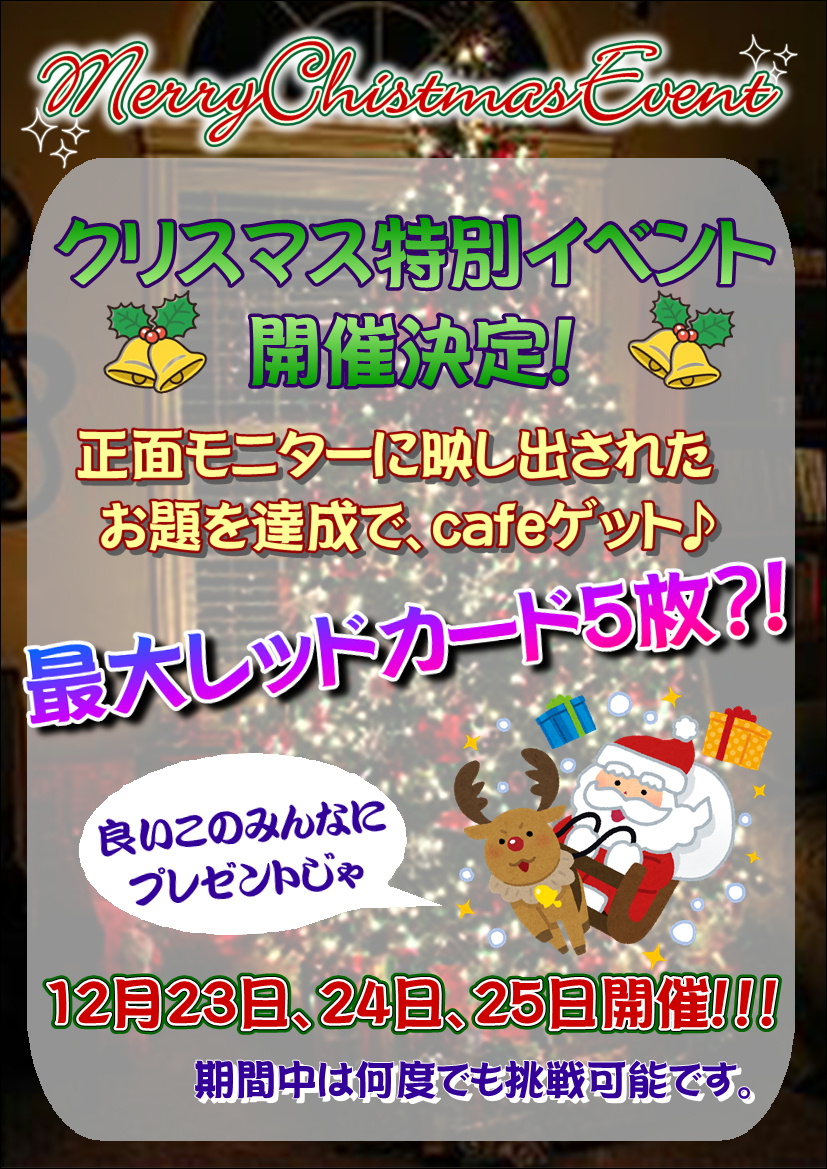 【クリスマスイベント】 2022/08/08 mfstaff 今年もやってまいりました クリスマス♪ 下赤塚店では、普段とはまた違ったクリスマス仕様の4マスビンゴを開催します! 通常の4マスビンゴとは違う点は かかれているお題に対して獲得できるご褒美が違い 何度でも挑戦できる形になっています! 百聞は一見に如かず。 ぜひ店内でご確認を! 挑戦お待ちしてます~ Prev 『連勝祭り』 Parent イベント情報 Next スーパーハント