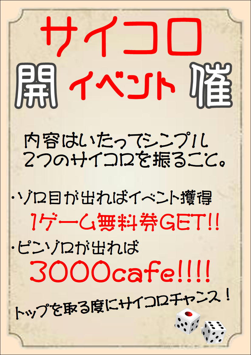 [サイコロイベント] 2022/05/01 mfstaff 特別イベント開催します!! ルールはとても簡単! トップを取ると卓上のサイコロを振ることができ、ゾロ目が出れば CafeをGet! ピンゾロならなんと3倍!! 条件は取るだけですので、 皆様のご参加お待ちしております! Prev 【年始特別イベント】 Parent イベント情報 Next 『連勝祭り』